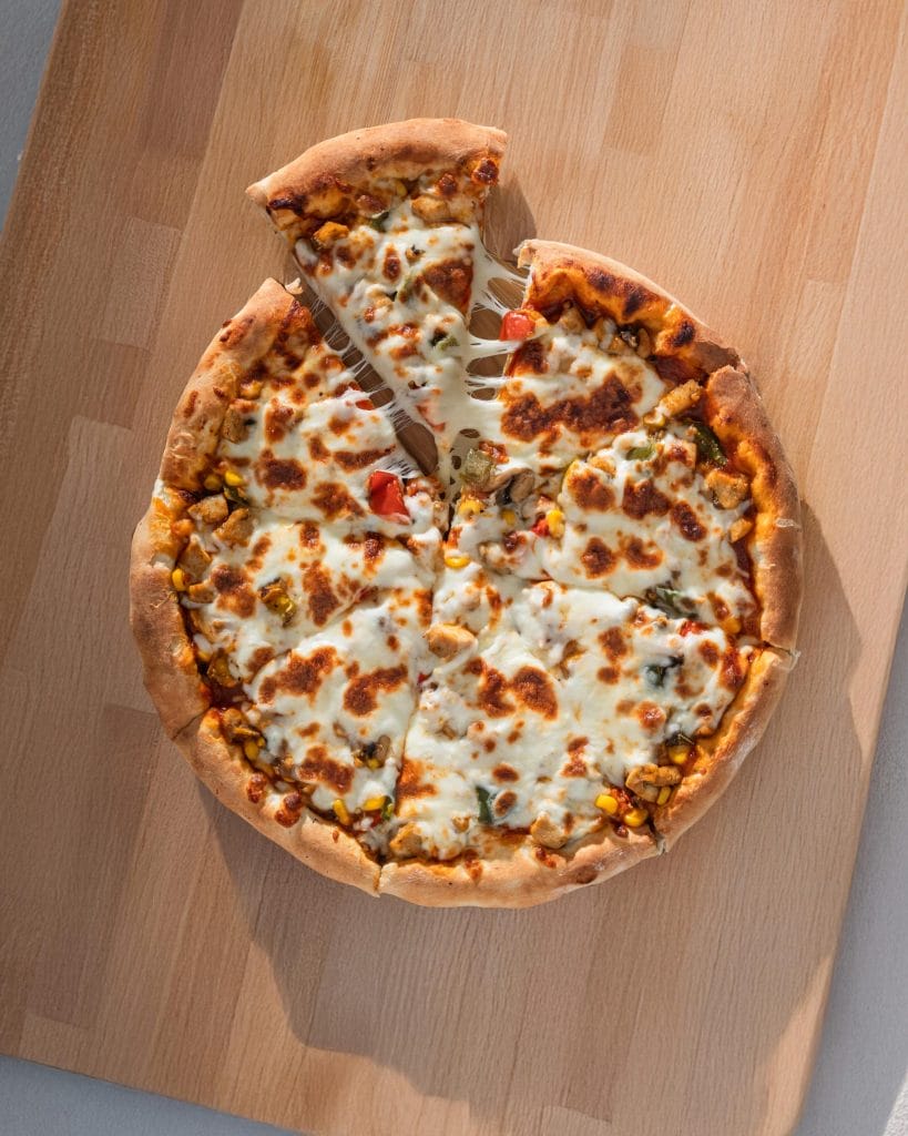 Pizza Fajita is a flavorful fusion topped with spicy chicken, sautéed peppers, onions, and melted cheese on a crispy crust.